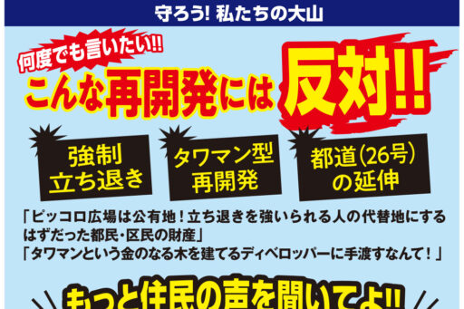 25.09.24 10月5日(日) 開催予定「大山問題住民デモ」第6弾! 何度でも言いたい! こんな再開発には反対! ・矯正立ち退き ・タワマン型再開発 ・都道(26号)の延伸 ピッコロ広場は公有地!立ち退きを強いられる人の代替地にするはずだっ ...続きを見る